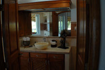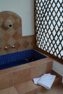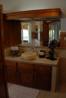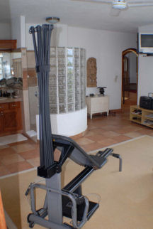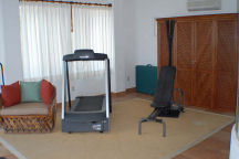 On step down from the top level and above the garage, the main villa has a private, air-conditioned Gym/Spa space with Bowflex strength trainer, professional Precor treadmill and its own ensuite bath and shower. You can watch satellite television while doing your morning workout. A small terrace off the Gym/Spa has a Japanese soaking tub tiled in cobalt blue Italian glass tile. A professional massage table is also located here. The gym has a queen size wall bed with a premium quality pillow-top mattress. |