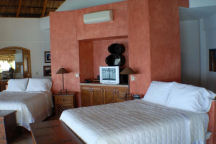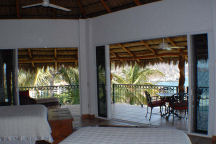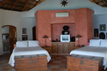 The bedroom and terrace areas are covered in a traditional Mexican Palapa (palm) roof. There are two queen pillow-top beds and an ensuite bath with bidet and huge shower with windows looking out to the Pacific. There is a generous walk-in closet as well as his and her closets.